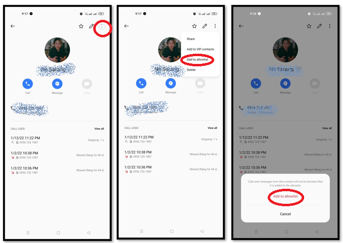 Select the Calls section, enter the phone number, and tap the three dots a second time. It will show options, and you may choose one by tapping the Add to Allowlist button.